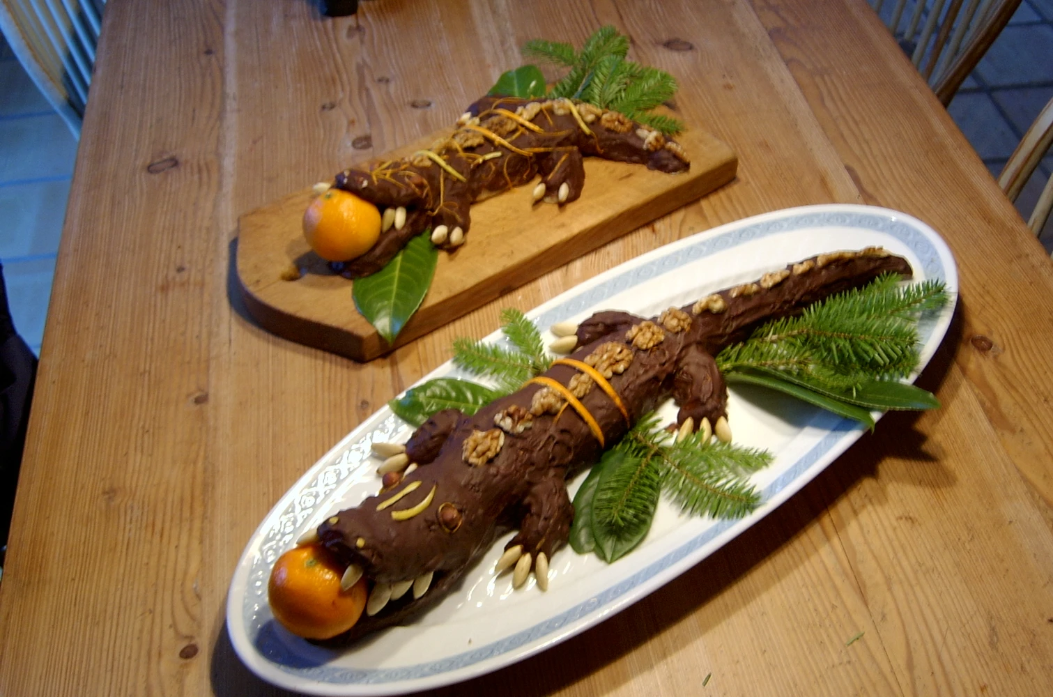 Vi plejer at lave en marcipan, rom krokodille eller to i starten af December. De er spist inden jul. Der kommer mange gæster... Det er festligt at forme marcipanmassen sammen, især sammen med børn.
