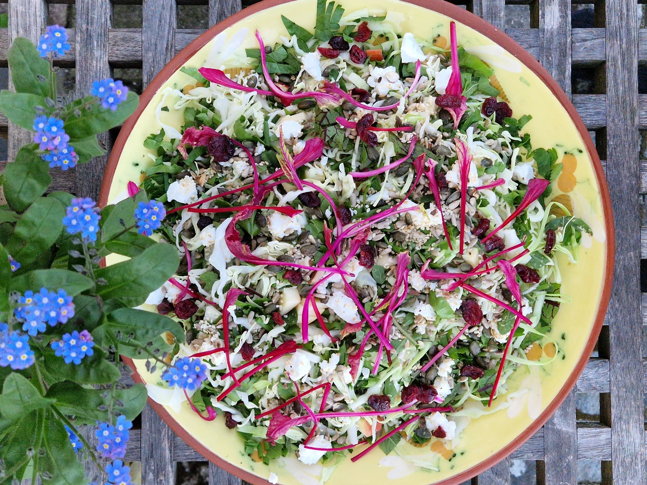 Fantastisk sprød og enkel forårssalat med spirer, urter og kerner.