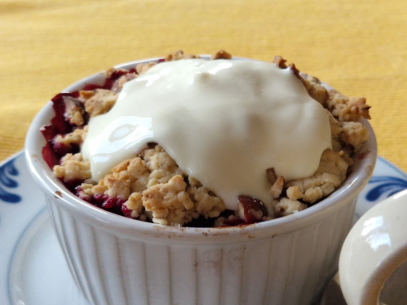 Brombærtærte med smuldredej. Brombærene plukkede vi i sommers, i det store brombærkrat i sommerhusets have.