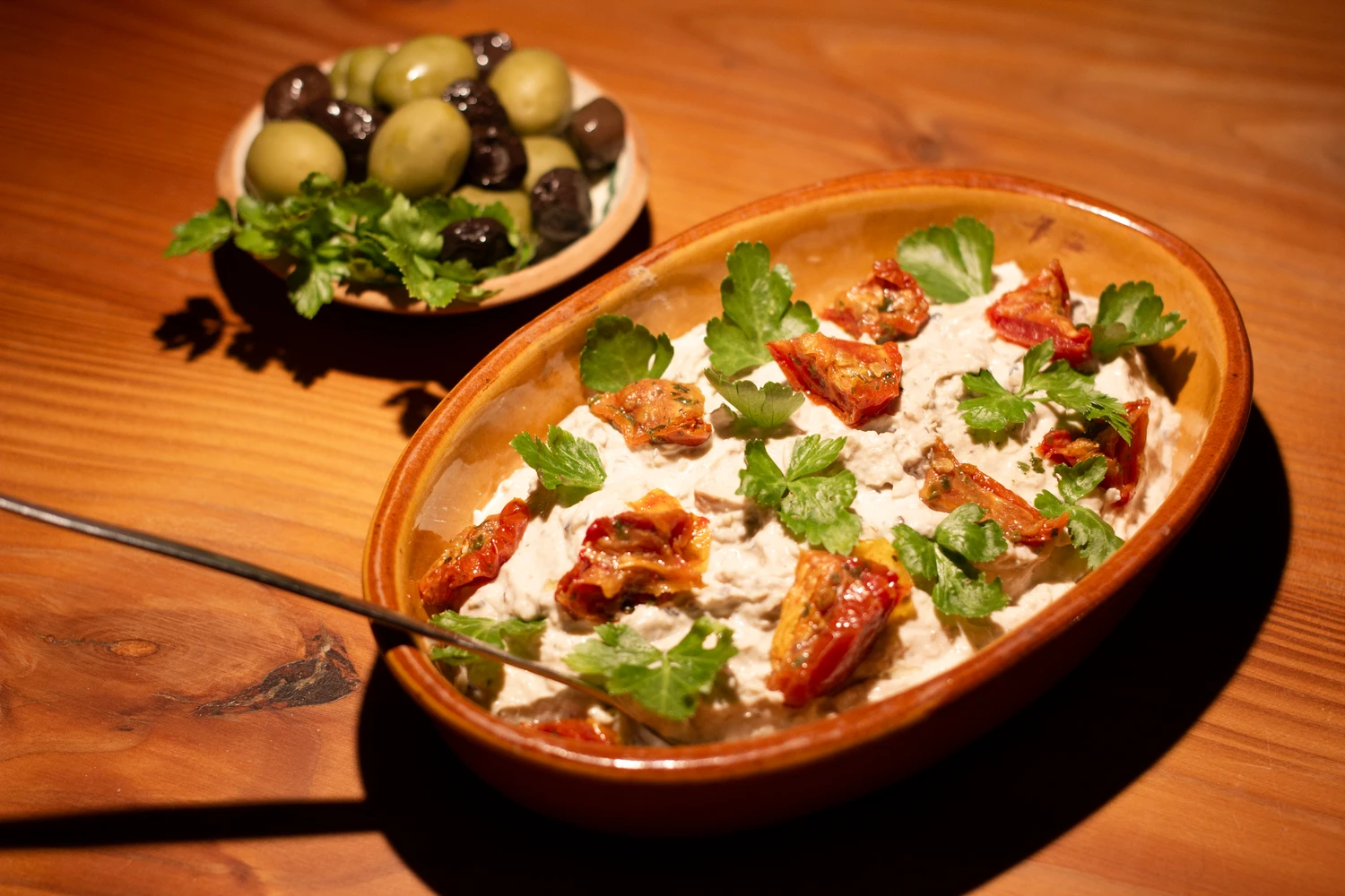 Pynt med soltørrede tomater og frisk persille fra drivhuset.