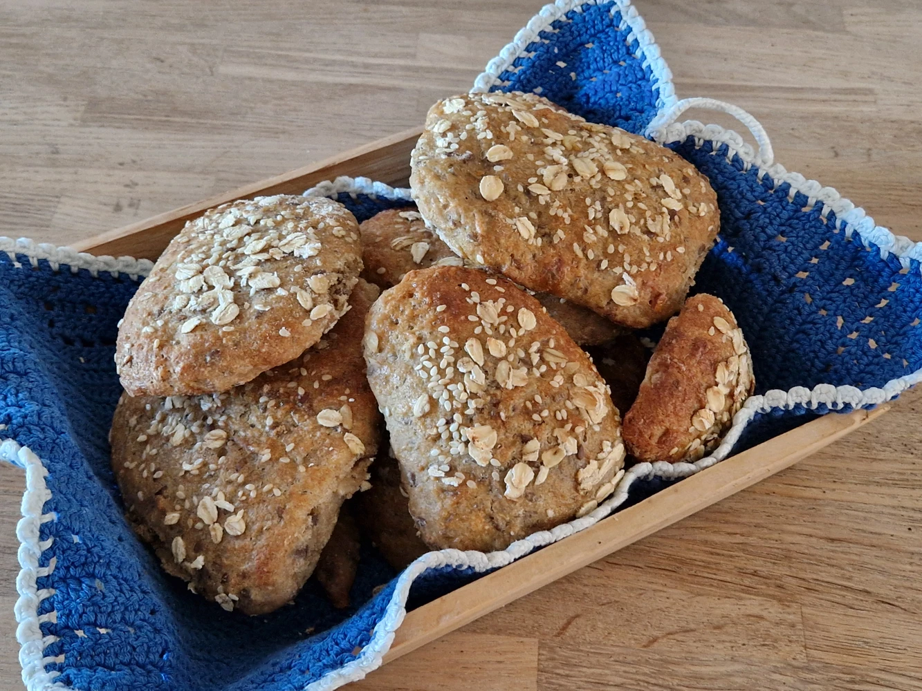 Hæld ud på meldrysset bord. Brug bagespatel tila at skære dejen ud til boller. Sæt på bagepapir. Pensel m. Sammenpisket æg - drys m. Havregryn og solsikkekerner.